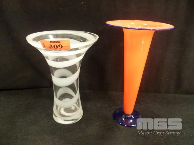 2 x SIGNED PIECES GLASS VASES, 25 & 28cm (H), ORANGE/BLUE & WHITE & CLEAR