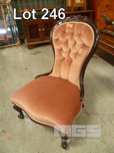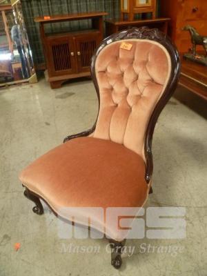 VINTAGE GRANDMOTHER CHAIR, ORNATE CARVED TIMBER, PINK VELVET, DEEP BUTTON