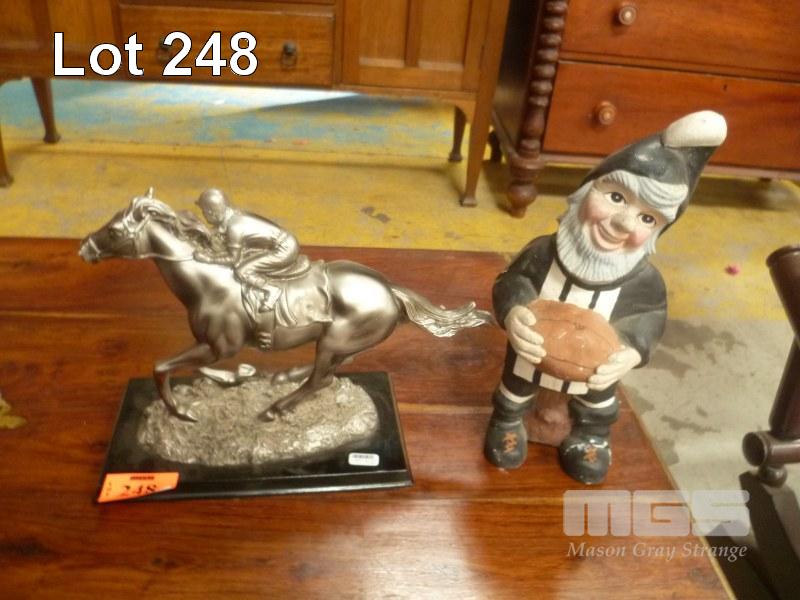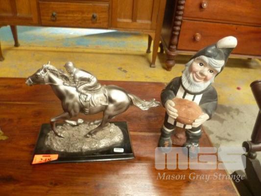 COMPOSITE STATUE HORSE & JOCKEY, 25cm (H) & CONCRETE PORT MAGPIE GARDEN GNOME, REPAIR TO HEAD & FOOT