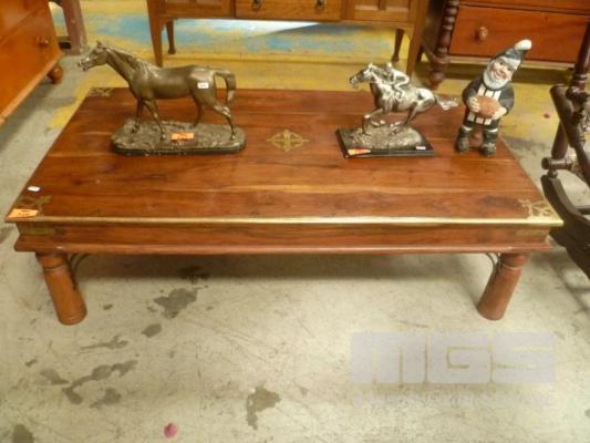 PINE RECTANGULAR COFFEE TABLE, BRASS TRIM & INSERTS