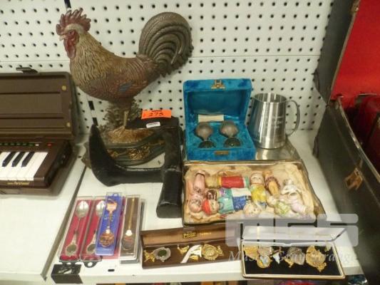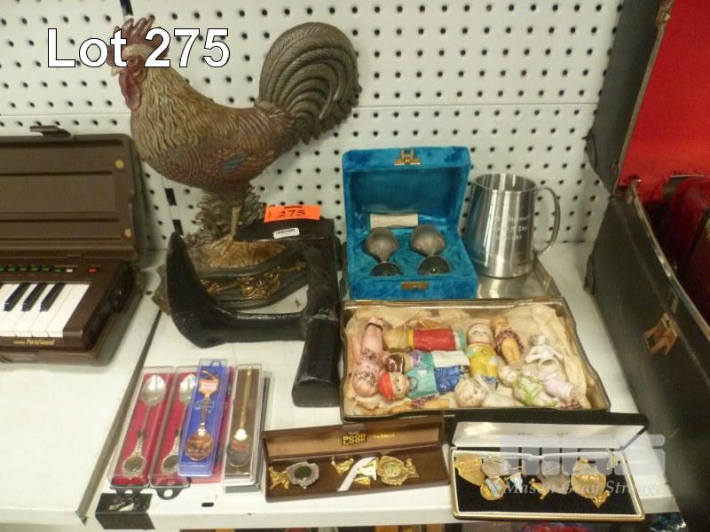 ASSORTED SOUVENIR SPOONS, PORCELAIN FIGURINES, ENAMEL SPORTING PINS, PEWTER MUG, ETC