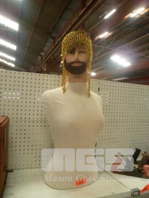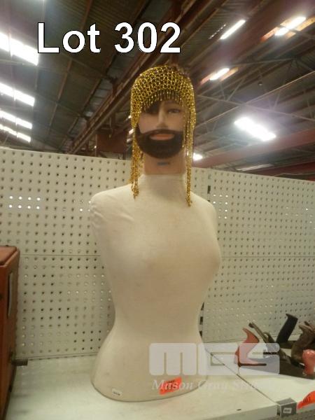 FEMALE BUST MANNEQUIN, MALE HAIRDRESSER HEAD & PLASTIC HEAD DRESS