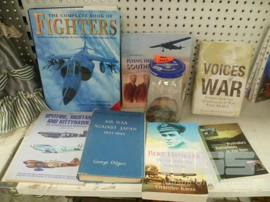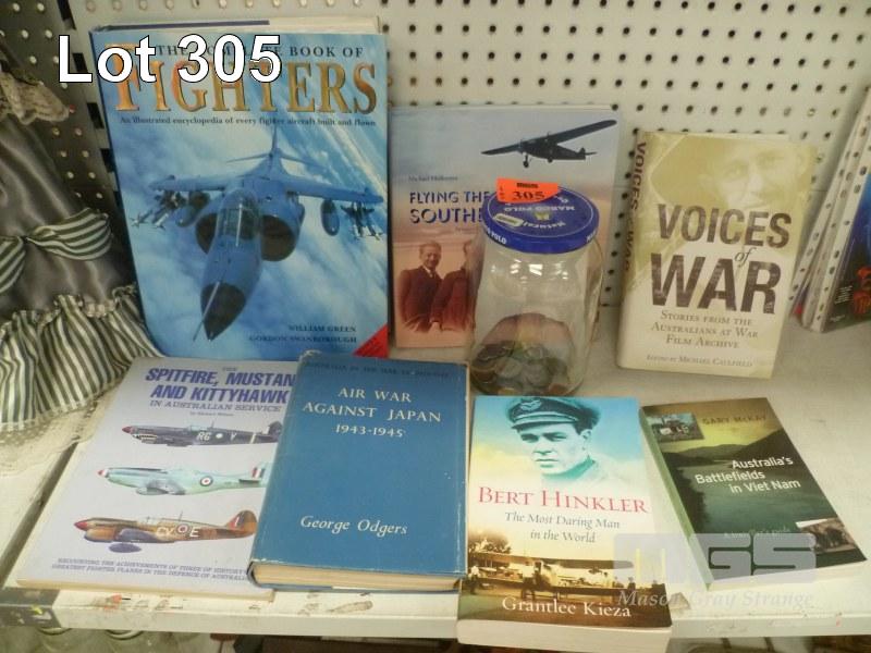 ASSORTED WORLD COINS & BOOKS RELATING TO MILITARY AIRCRAFT