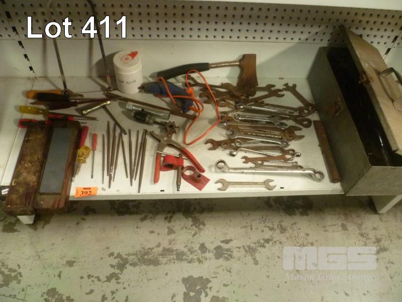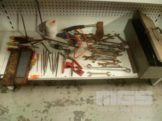 ASSORTED TOOLS INC TOOL BOX, STONES AXE, HAND SAWS, CHISELS, SIDCHROME SPANNERS, A/F & WHITWORTH
