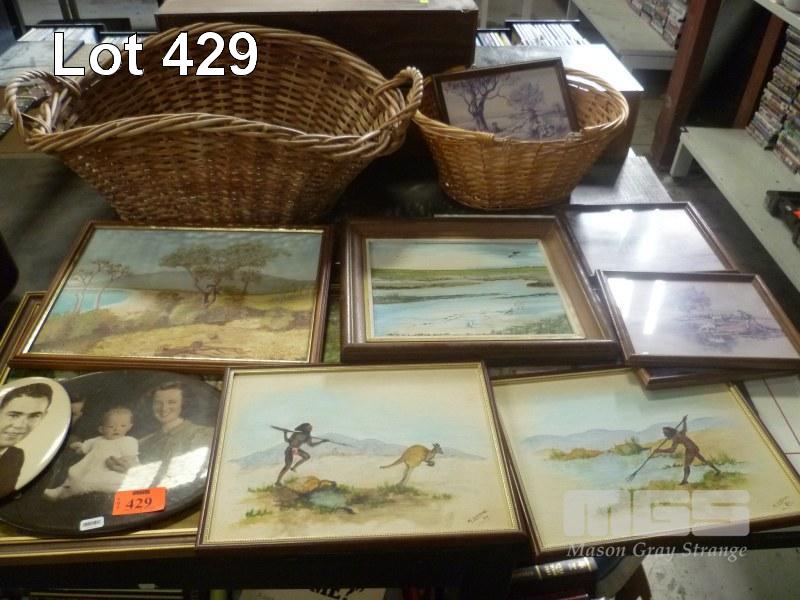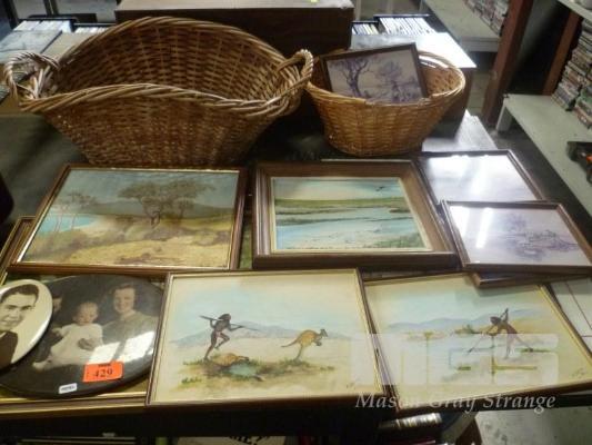 ASSORTED FRAMED PAINTINGS,PRINTS, VINTAGE PHOTOGRAPHS & 2 x WICKER BASKETS