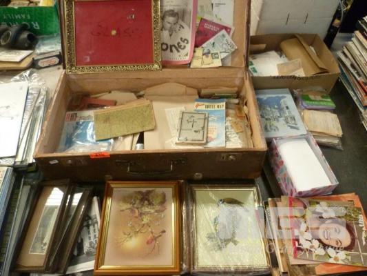 VINTAGE SUITCASE WITH EARLY EPHEMERA FRAMED PRINTS, BLACK & WHITE PHOTOGRAPHS, ETC