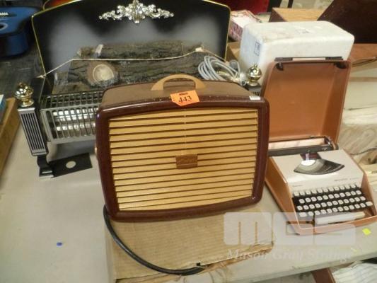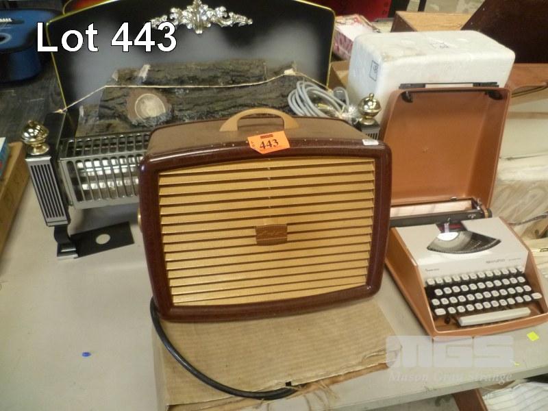 IMITATION LOG HEATER AND VINTAGE ASHTON ELECTRIC HEATER AND REMINGTON SUPERITER TYPEWRITER