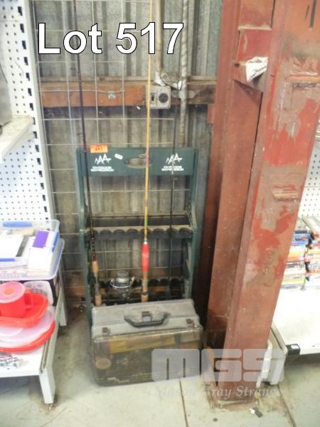 FISHING RODS, STAND & PIANO TACKLE BOX & CONTENTS ASSORTED TACKLE