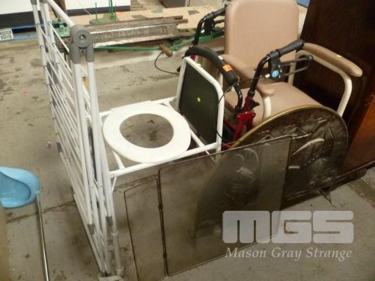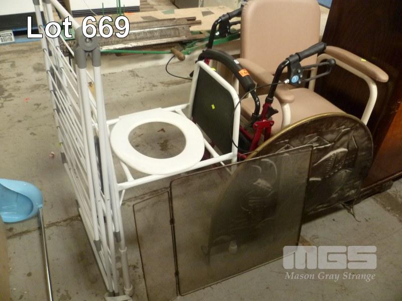 2 X ASSIST CHAIRS, RED MOBILITY WALKER, AIRER & FIRE SCREENS