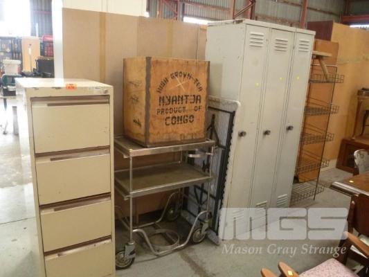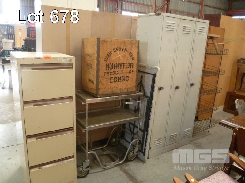 METAL 4 DRAWER FILING CABINET, STAINLESS STEEL TROLLEY, TRESTLE TABLE, 3 x SINGLE DOOR LOCKERS, ETC