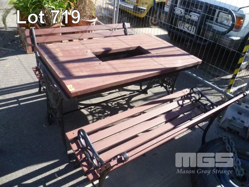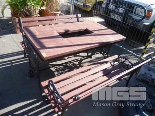 3 PIECE OUTDOOR SETTING, CAST IRON FRAMES, TIMBER SLAT INC RECTANGULAR TABLE & 2 x BENCH SEATS