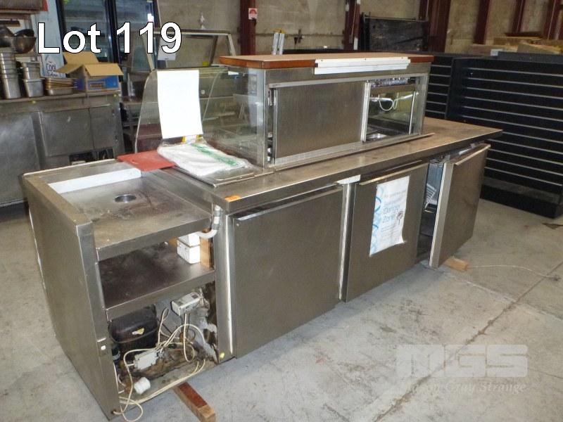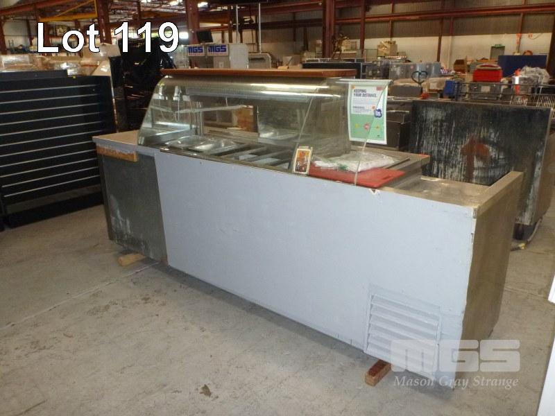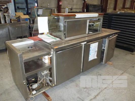 COLD FOOD SERVERY COUNTER, 283cm, BOW GLASS, 3 DOOR STAINLESS STEEL CASED, SELF CONTAINED UNIT, 240V