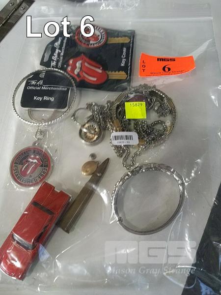 COSTUME JEWELLERY, "THE ROLLING STONES" KEYRINGS, "58 THUNDERBIRD" MATCHBOX CAR AND SPENT BULLET SHELL.