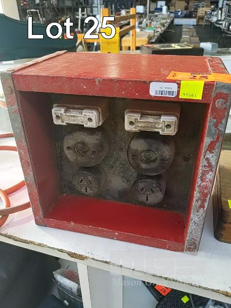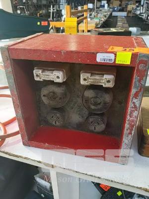 FABRICATED FUSED 2-PLUG MOBILE WALL HANGING POWER BOX WITH BAKELITE SWITCHES & SOCKETS AND CERAMIC FUSES MONTED IN WOODEN BOX. "THE ORIGINAL POWER BOARD"