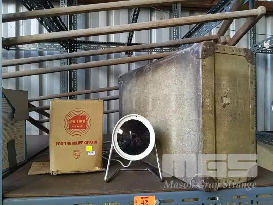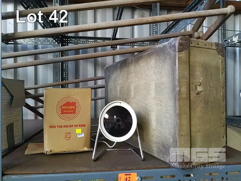 CLASSIC PHILIPS "INFRAPHIL" INFRARED HEAT LAMP "FOR THE RELIEF OF PAIN" WITH ORIGINAL BOX. VINTAGE SUITCASE AND VINTAGE WOODEN CLOTHES HORSE.