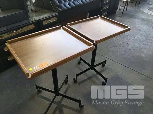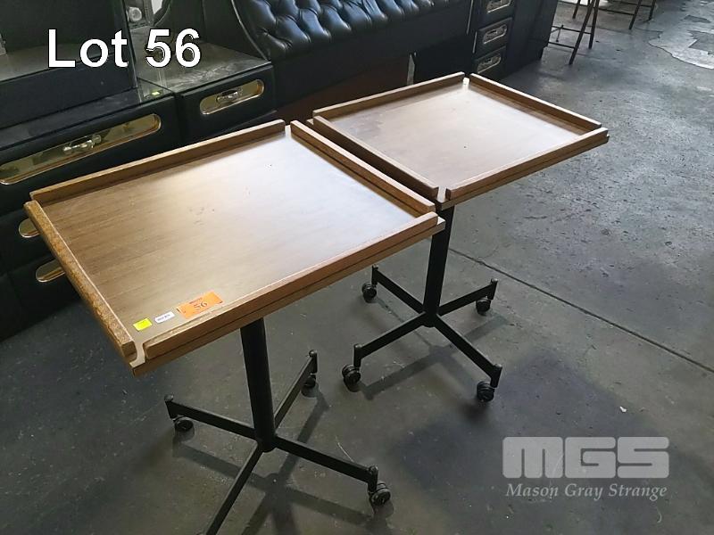2 x MOBILE TIMBER LAMINATE SIDE TABLES/TRAYS, ADJUSTABLE HEIGHT.