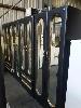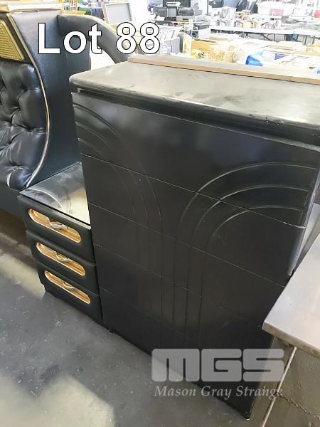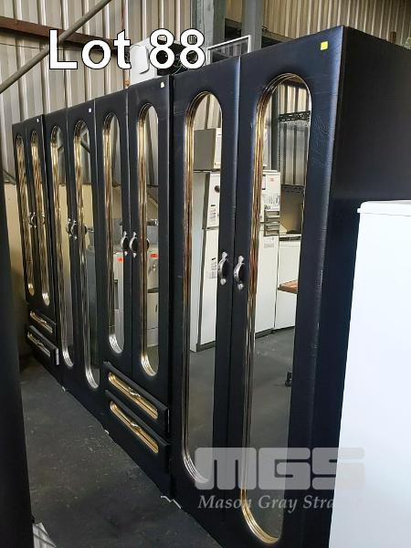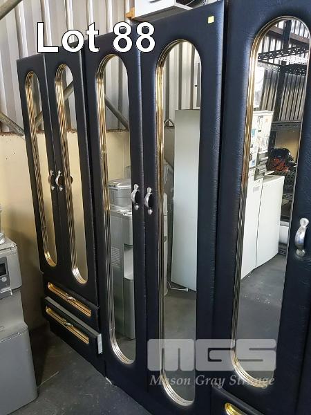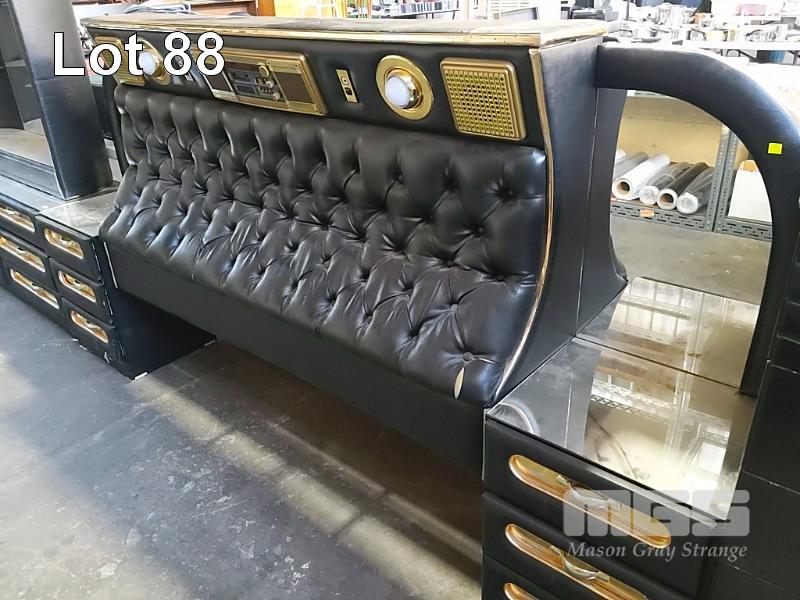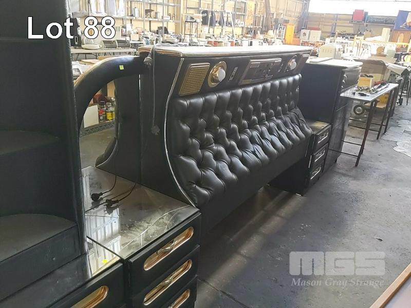 CLASSIC 70'S 7-PIECE BEDROOM SUITE IN BLACK VINYL WITH MIRROR SURFACES AND FAUX BRUSHED BRASS HANDLES & TRIM. INTRINSIC LIGHTS, POWER AND "VISTAMATRONIC" RADIO CASSETTE PLAYER, HEADPHONE JACKS & SPEAKERS MOUNTED IN SUPERB BLACK TUFTED BUTTON BEDHEAD. FAIR CONDITION, DAMAGE TO ONE MIRROR.