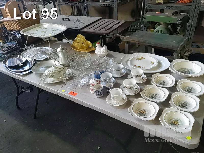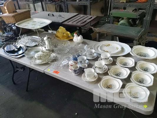 SERVINGWARE, BONE CHINA, CUT GLASS BOWLS & DISHES, TRAYS, CUPS AND SAUCERS, PLATTERS ETC. NOTE VINTAGE WORCESTER BED TABLE.