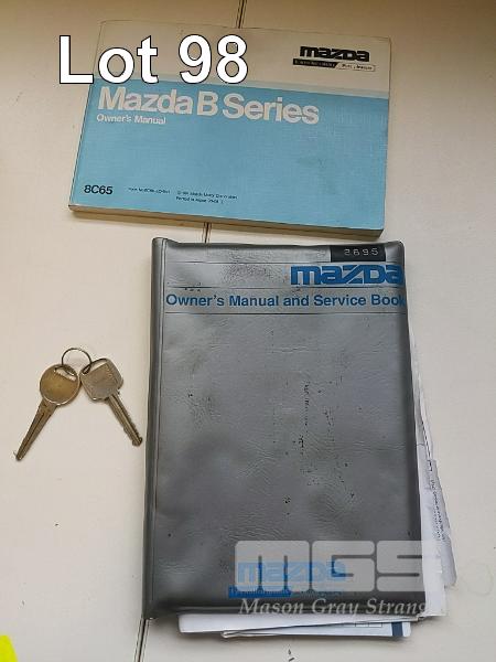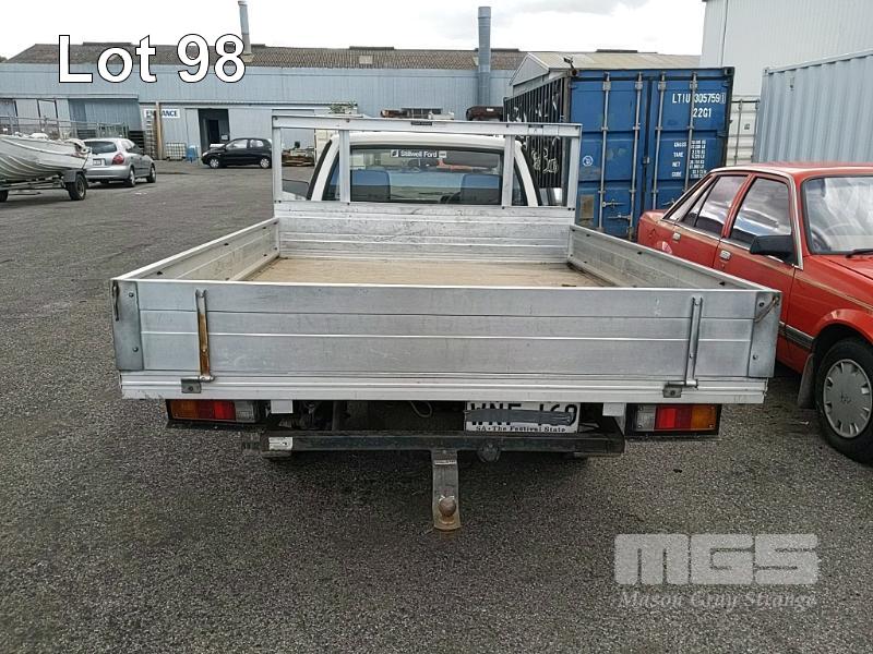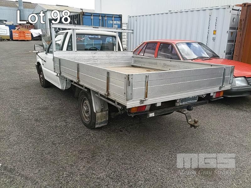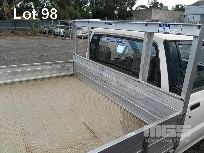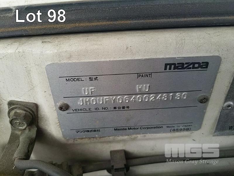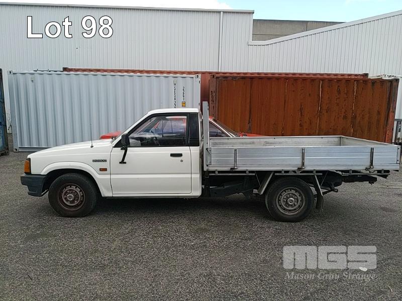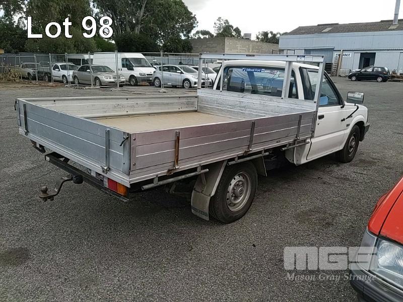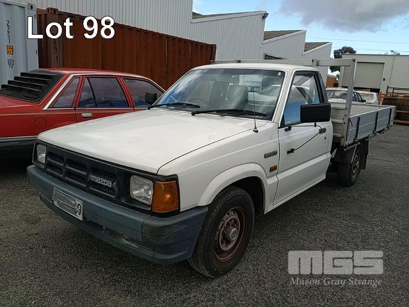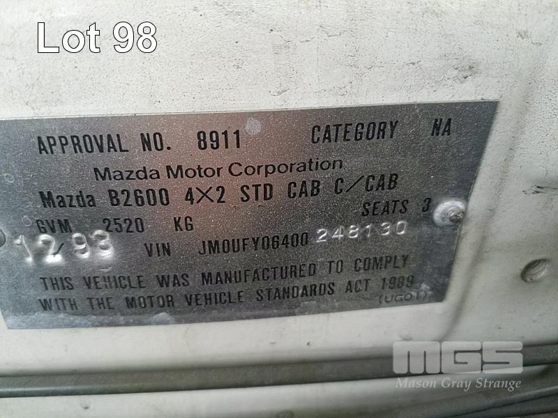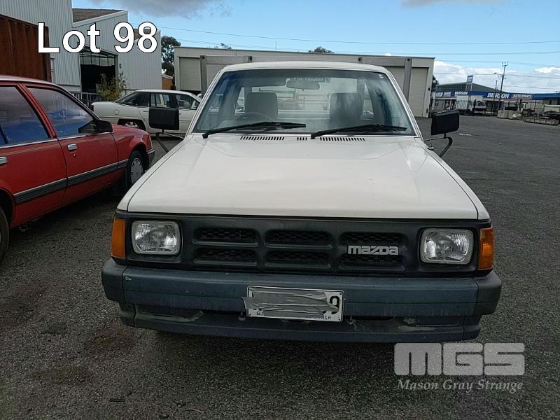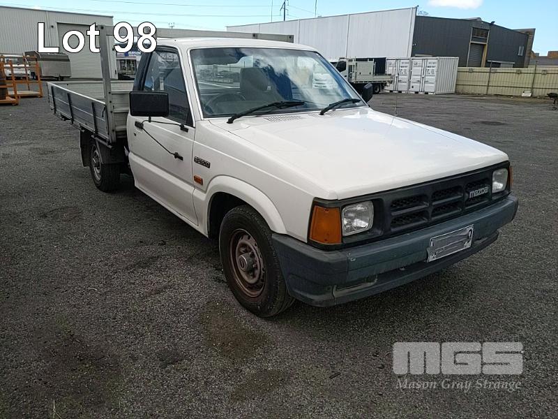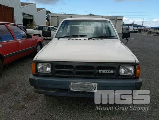 93 MAZDA B2600 UTILITY REG: (SA) (EXPIRED) VIN: JM0UFY06400248130G ENG: G6163740 ODO: 150000 2.6L 4 CYLINDER, 5 SPEED MANUAL, UNLEADED, WHITE, 2 DOORS, 3 SEAT, AIR CON, SPARE WHEEL, TOW BAR, "TRIPLE M" ALUMINIUM UTE TRAY 1,850x2,500mm WITH HEADBOARD & QUICK HITCH ROPE RAILS. (WITH PAPERS, WITH 1 KEY/S, WITH OWNER'S MANUAL, WITH SERVICE BOOKS) CONDITION: DRIVER'S SIDE DOOR DOOR JAM TRIM - INDENT DRIVER'S SIDE DOOR B PILLAR - INDEED BATTERY - NO BATTERY BRAKES - DEFECTIVE