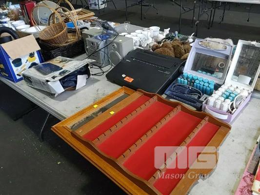 AUDIOSONIC MINI HI-FI, CANE BASKETS, AUTO VACUUM, MIRROR, SPOON RACK, HAIR CURLERS, ELECTRIC TYPEWRITER & AIR MATTRESS