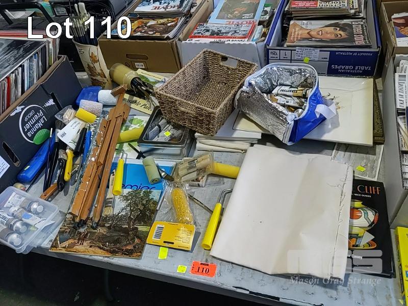 ASSORTED ART SUPPLIES, PAINTS, BRUSHES, EASEL, CANVAS ETC