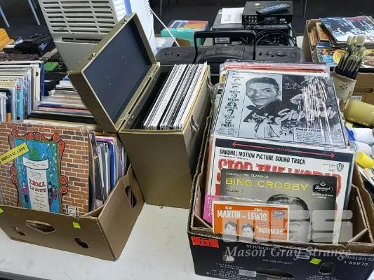 A LARGE SELECTION OF LP RECORDS, STAGE AND CINEMA SOUNDTRACKS. ESTIMATED 200 ITEMS APPROX. HOLLYWOOD, BROADWAY, LONDON'S WEST END, MGM, DISNEY, COLUMBIA, JUDY GARLAND, JULIE ANDREWS, LUCILLE BALL, BING CROSBY, DEAN MARTIN AND JERRY LEWIS ETC. TOO MANY TO MENTION INDIVIDUALLY. MOST MID 20TH C. (2 x CARTONS & LP CARRY CASE)