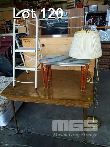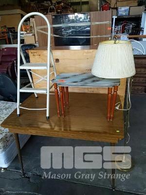 TIMBER LAMINATE EXTENSION DINING ABLE, NEST 2 TABLES, STEP LADDER & STANDARD LAMP