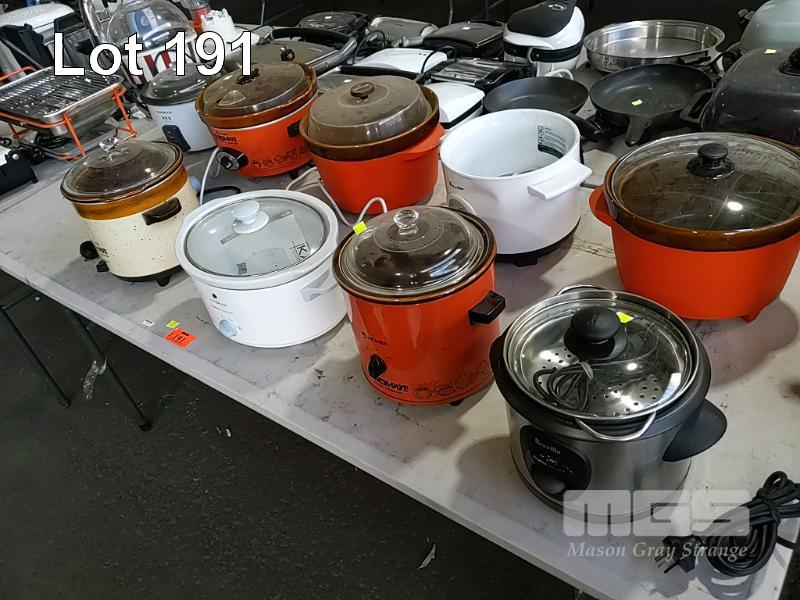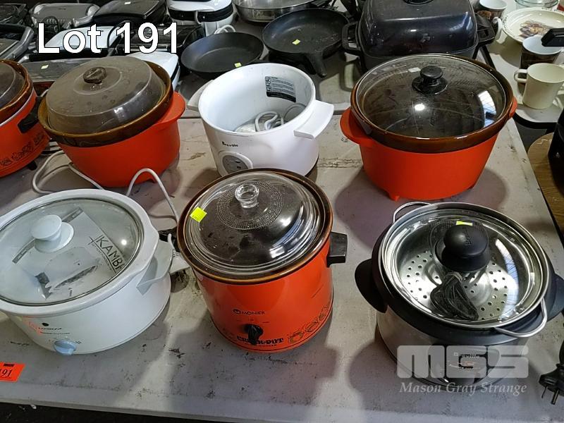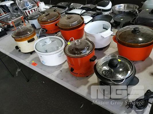 8 x SLOW COOKERS AND CROCK POTS. KAMBROOK, MONIER, BREVILLE ETC.*CONDITION UNKNOWN* SOME INCOMPLETE (1x TABLE)