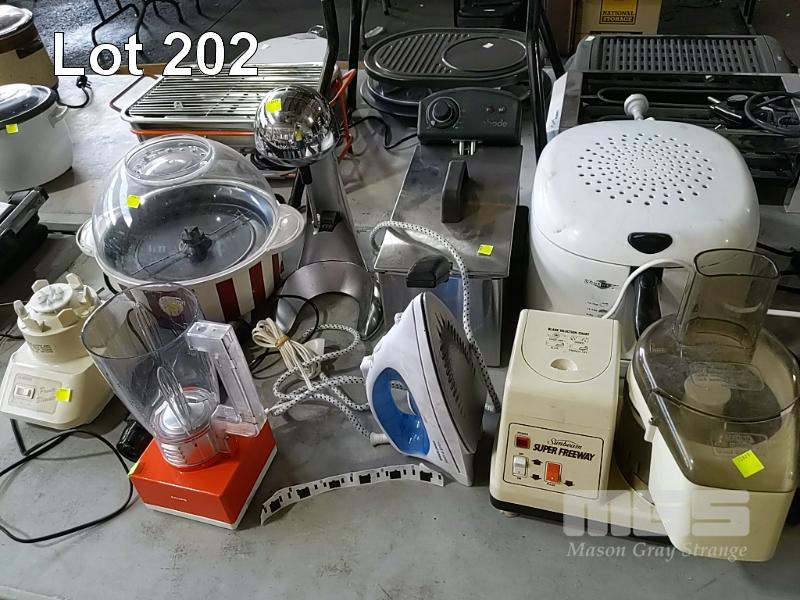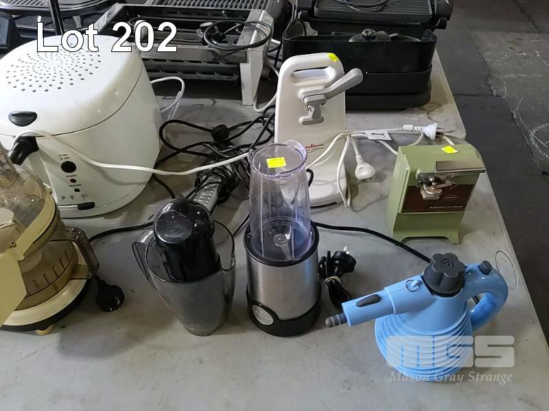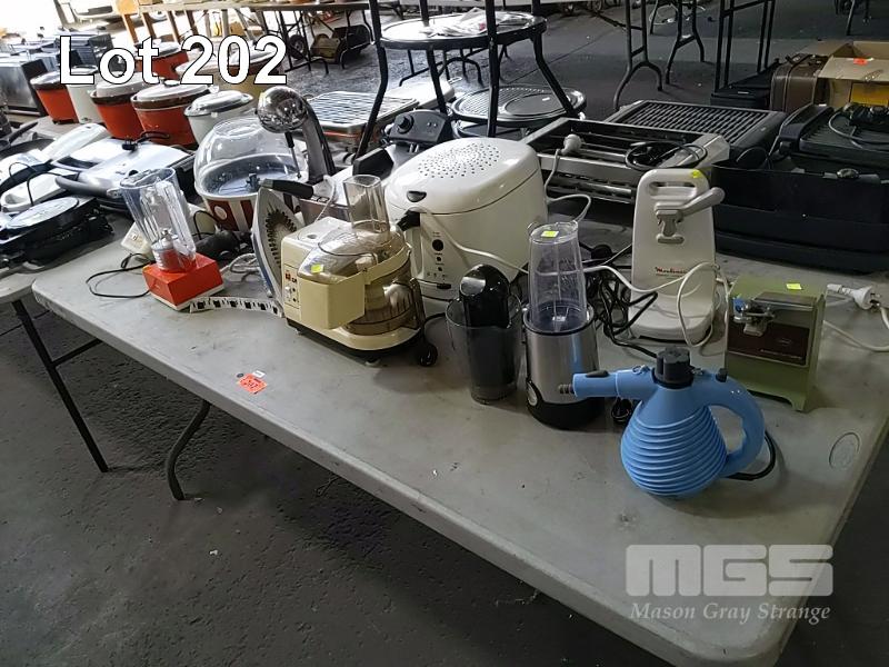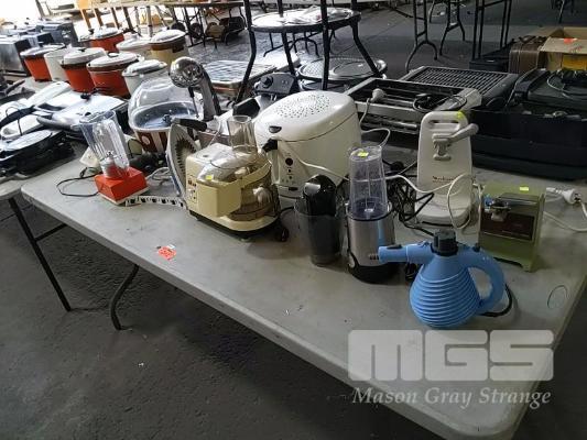 HOUSEHOLD KITCHEN APPLIANCES INCLUDING DEEP FRYERS, FOOD PROCESSOR, ELECTRIC CAN OPENERS, POPCORN MACHINE ETC (1 x TABLE) *MOST ITEMS INCOMPLETE CONDITION UNKNOWN *