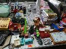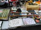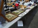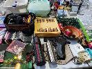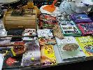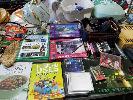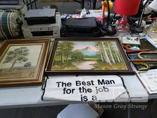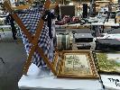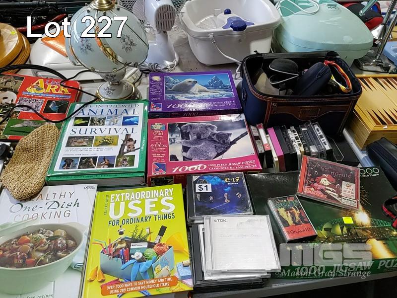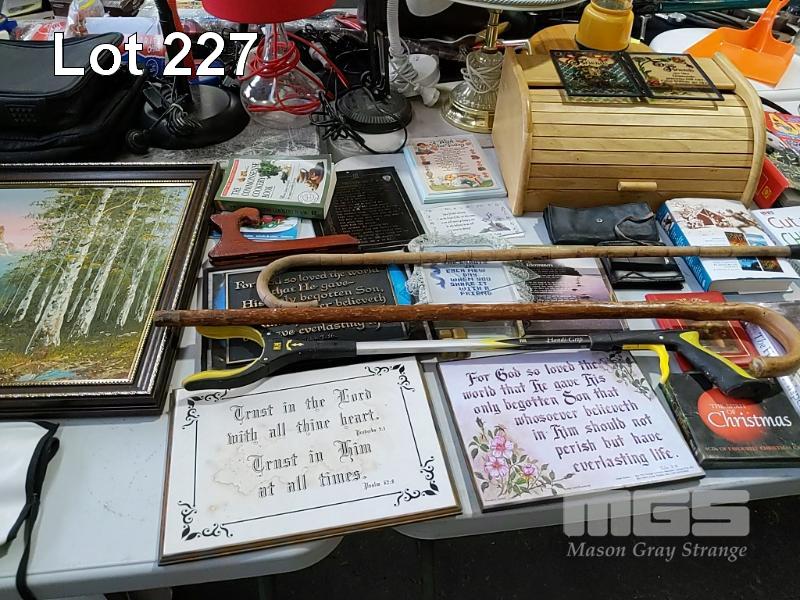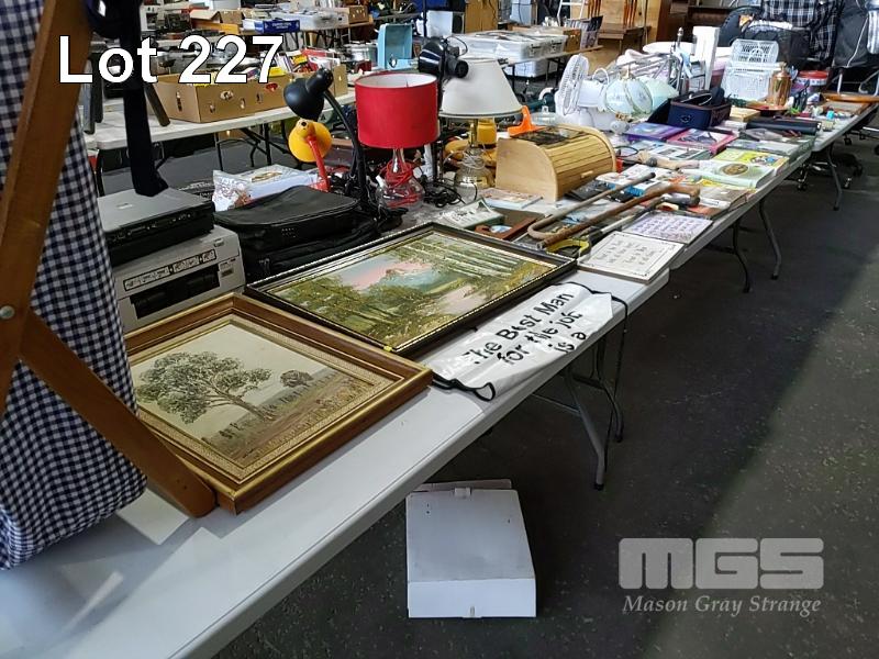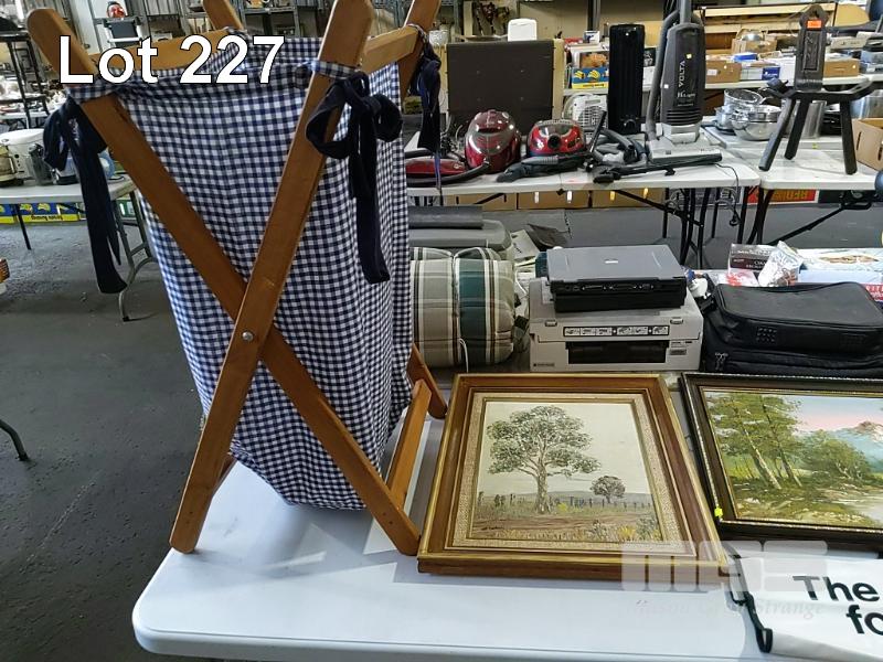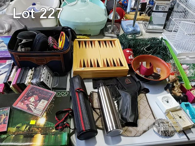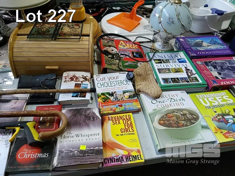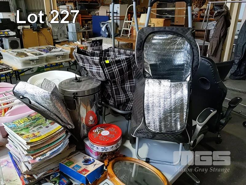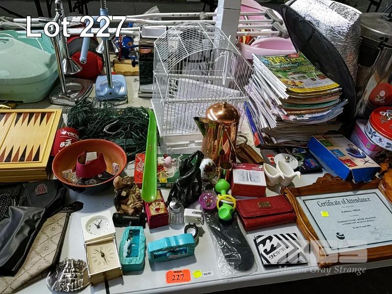 HOMEWARES AND OTHER PARAPHERNALIA INCLUDING SHOPPING TROLLEYS, COPPER COATED KETTLE, ORIGINAL ARTWORK, BIRDCAGE, JIGSAW PUZZLES, BOOKS, WALKING STICKS, LINEN BASKET, WALLETS, XMAS LIGHTS AND MORE (3 x TABLES)