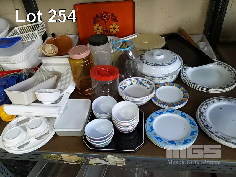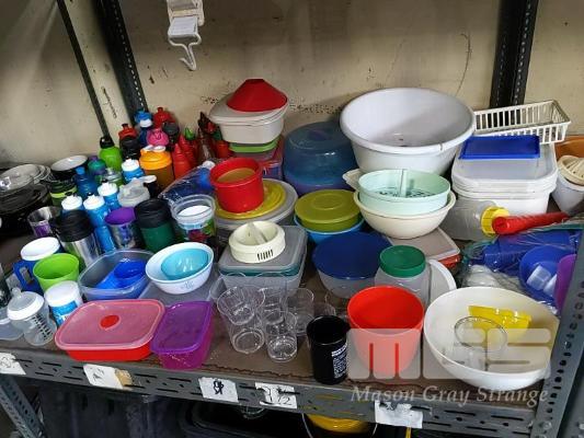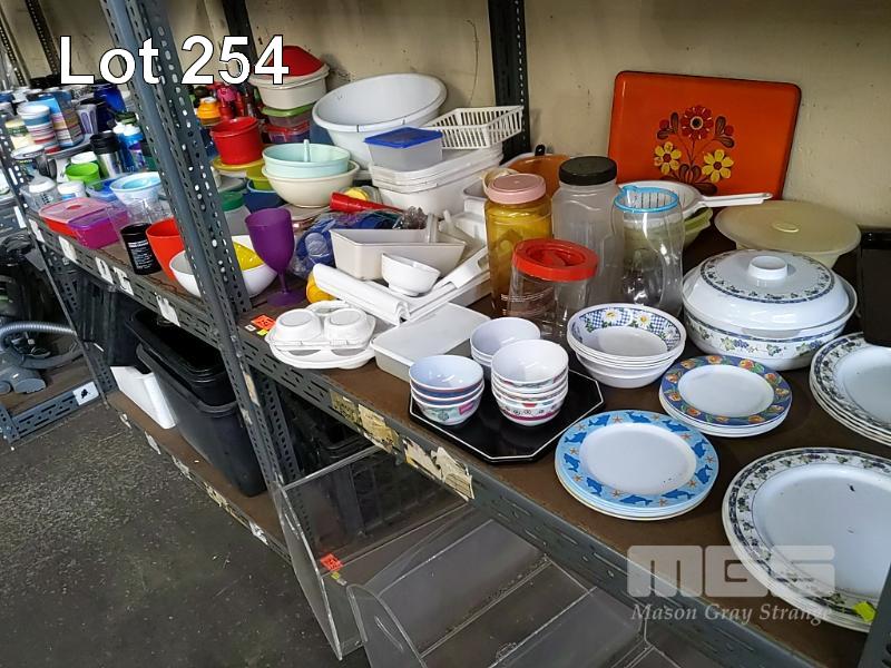LARGE QUANTITY OF PASTIC-WARE INCLUDING DRINK BOTTLES, STORAGE CONTAINERS, TRAYS, DINNER SETS, PICNIC SET, STORAGE JARS, CUPS ETC (2 x BAYS)