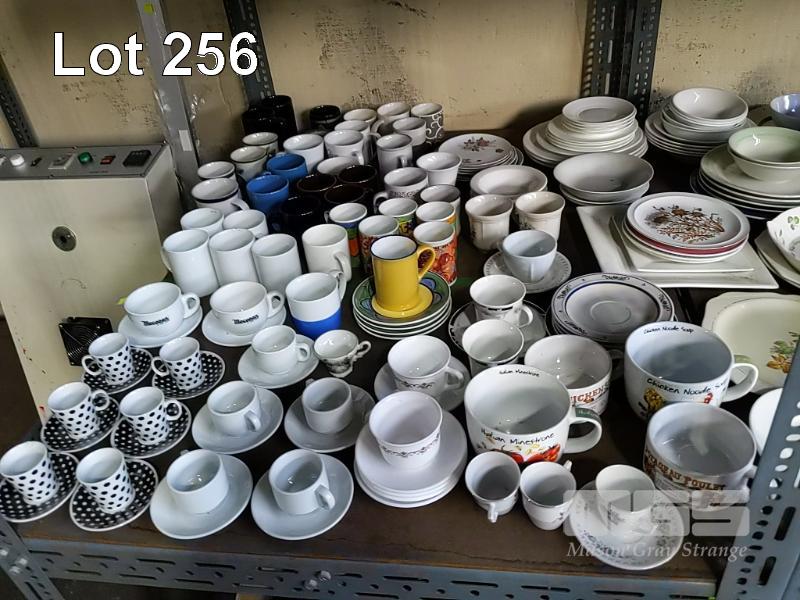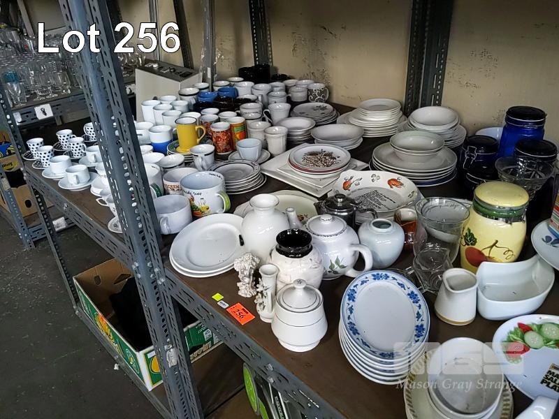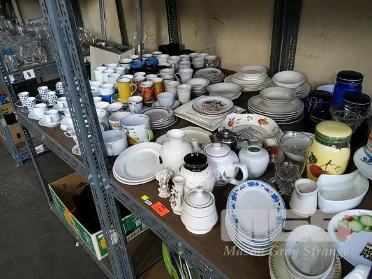 LARGE QUANTITY OF CROCKERY, CUPS, MUGS AND OTHER SERVING WARE, STORAGE WARE ETC (2 x BAYS)