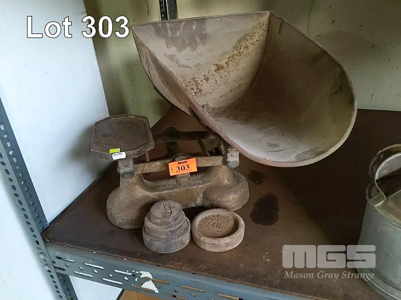 VINTAGE "S.A. SCALES CO. 28 LBS" BALANCE SCALES WITH HOPPER AND VARIOUS WEIGHTS.