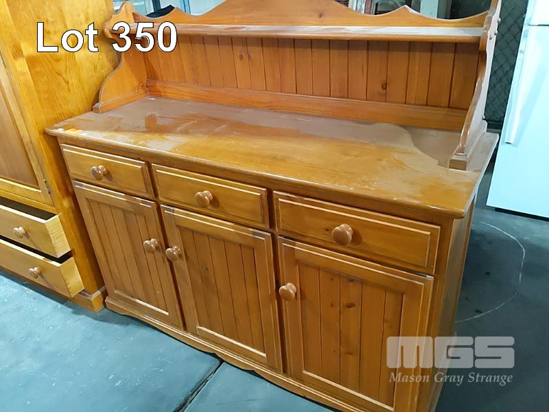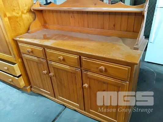 PINE BUFFET, 3 DOOR/DRAWER WITH OVERSHELF ON CASTOR WHEELS MELCHAIR FURNITURE, VICTORIA (NOTE: SPLIT TO CENTRAL DOOR)