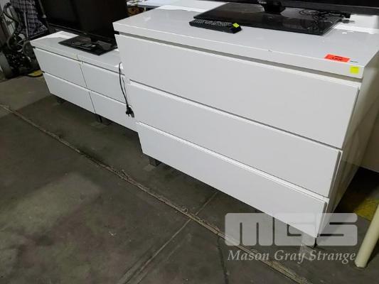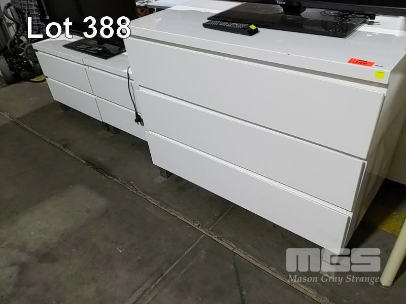 CONTEMPORARY HIGH GLOSS WHITE 3-PIECE BEDROOM SUITE. 2 x 2-DRAW BEDSIDE TABLES AND 3-DRAWER CHEST OF DRAWERS.