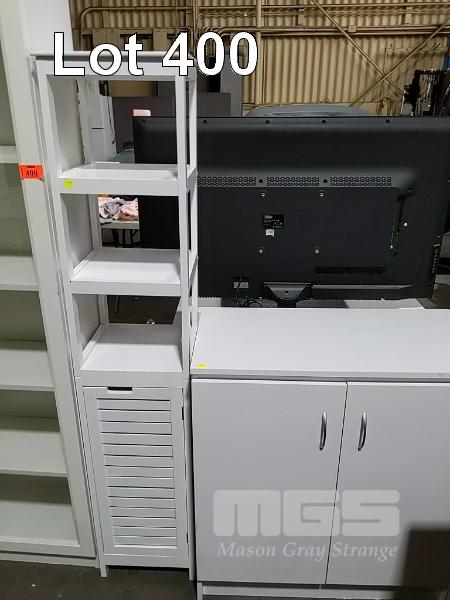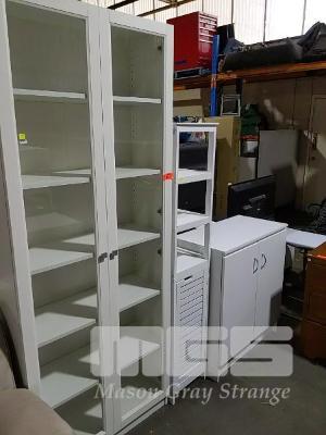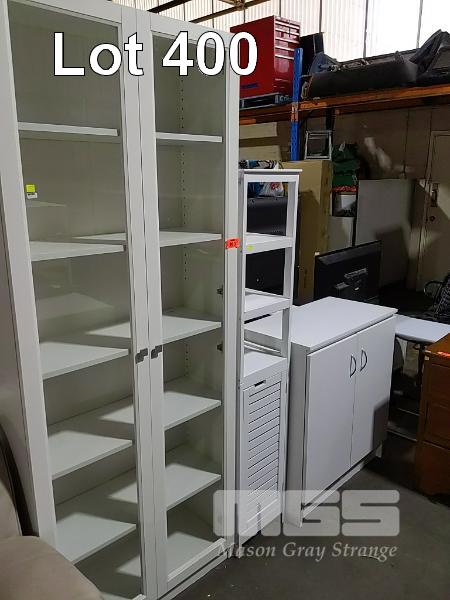 6-SHELF, 2-DOOR DISPLAY CABINET/BOOKCASE. SINGLE DOOR 4-SHELF CORNER DISPLAY UNIT AND 2-DOOR CABINET. ALL IN WHITE.