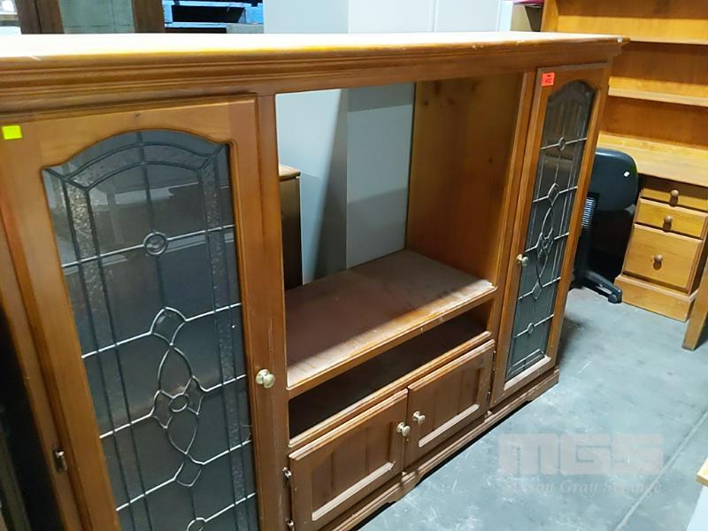 TIMBER TV CABINET WITH LEAD GLASS DOORS.