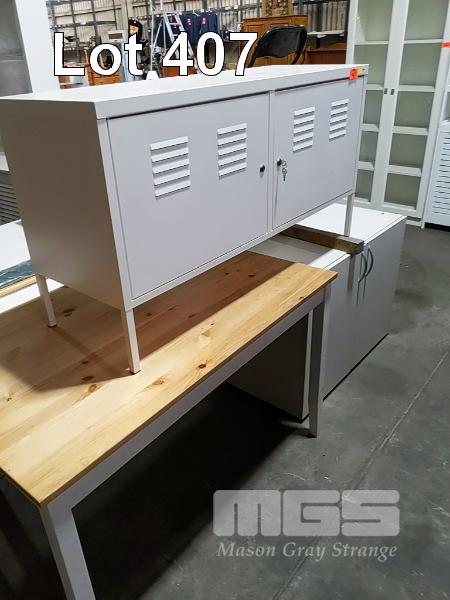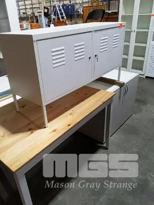 LOWLINE LOCKABLE METAL OFFICE STORAGE CREDENZA. IKEA DESK AND 2-DOOR CABINET