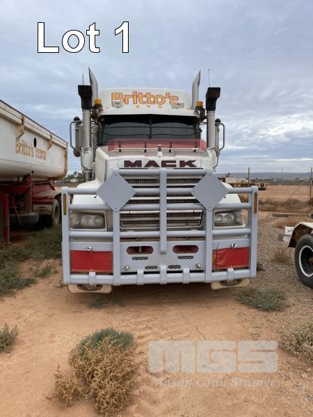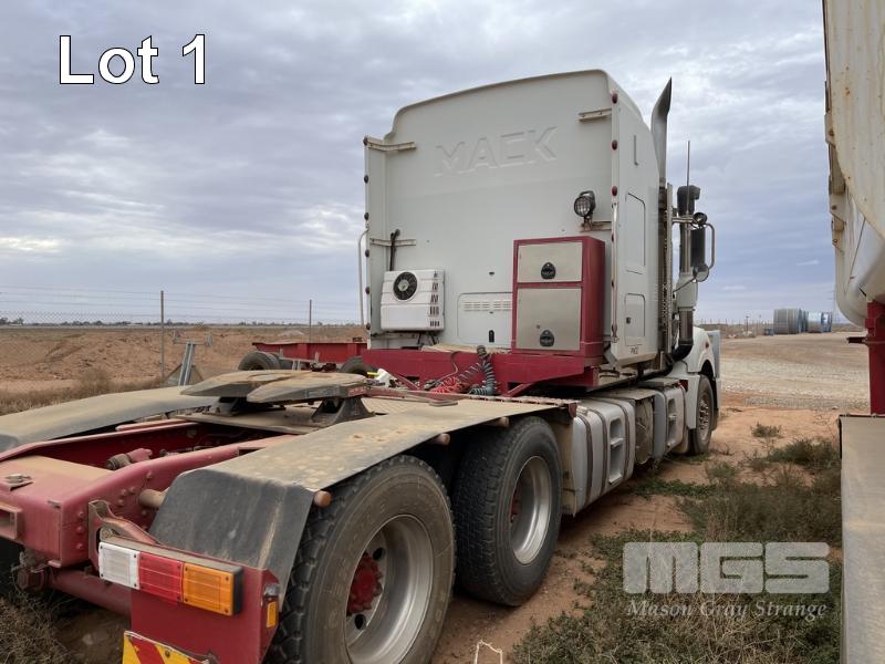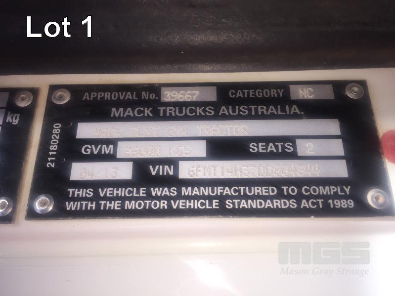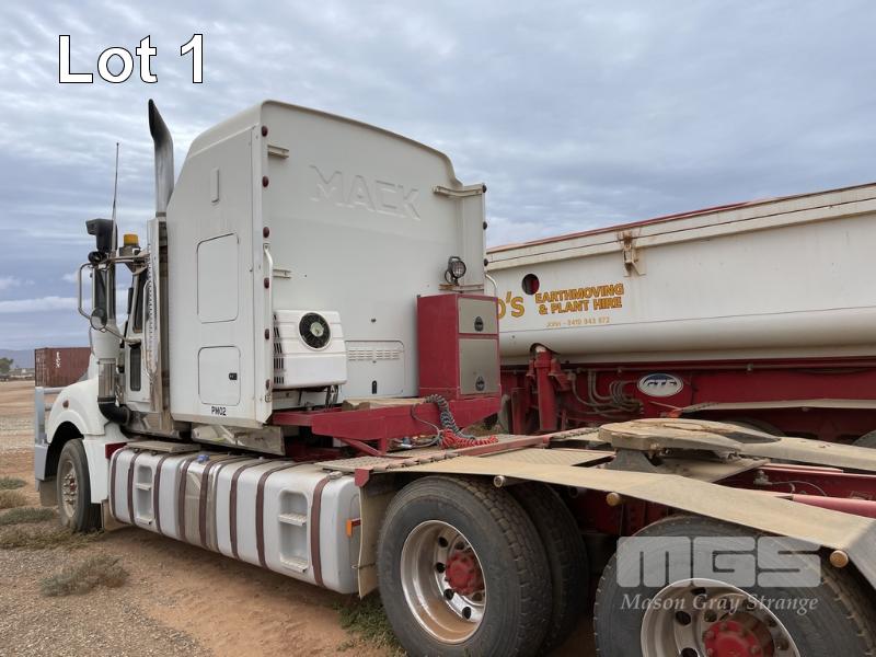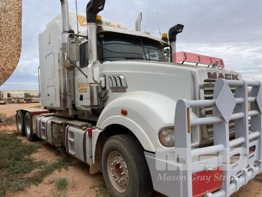 2013 MACK SUPERLINER CLXT 6x4 PRIME MOVER REG: 1GAF 371 (WA) VIN: 6FMT14H37DD804344 ODO: 750,00kms MP10 600HP, AUTOMATIC TRANSMISSION, AIRBAG SUSPENSION, AIR CON, ROAD TRAIN RATING: 131,000 kg 60" SLEEPER ALLOYS HYDRAULICS BULL BAR