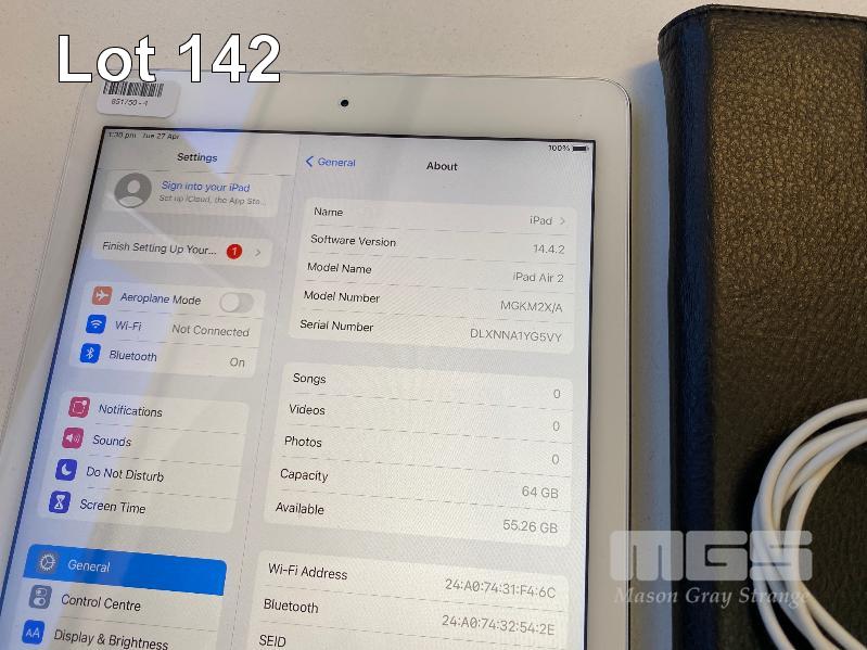 APPLE iPAD AIR 2, 64GB, Wi-Fi, SILVER, MODEL A1566 WITH CABLE, CHARGER & COVER S/N:DLXNNA1YG5VY