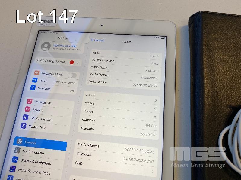 APPLE iPAD AIR 2, 64GB, Wi-Fi, SILVER, MODEL A1566 WITH CABLE, CHARGER & COVER S/N:DLXNN90XG5VY