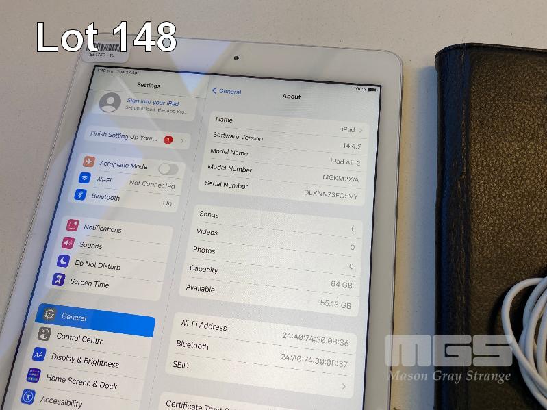 APPLE iPAD AIR 2, 64GB, Wi-Fi, SILVER, MODEL A1566 WITH CABLE, CHARGER & COVER S/N:DLXNN73FG5VY