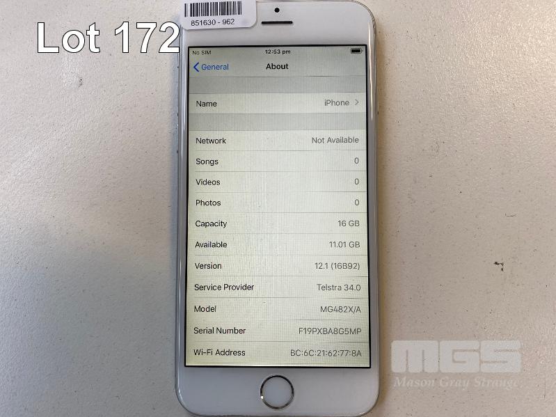 APPLE iPHONE 6, 16GB, SILVER, MODEL A1586 (NO CHARGER, NO CABLE) S/N:F19PXBA8G5MP