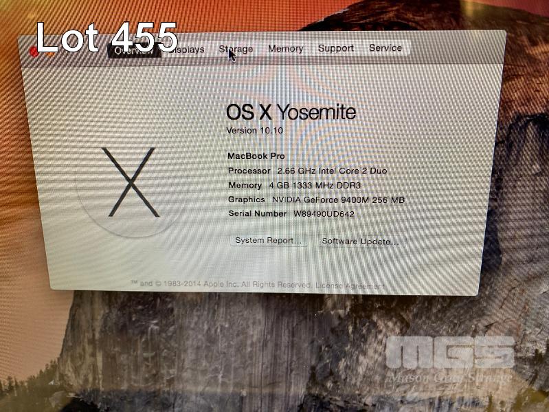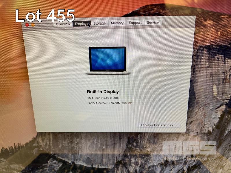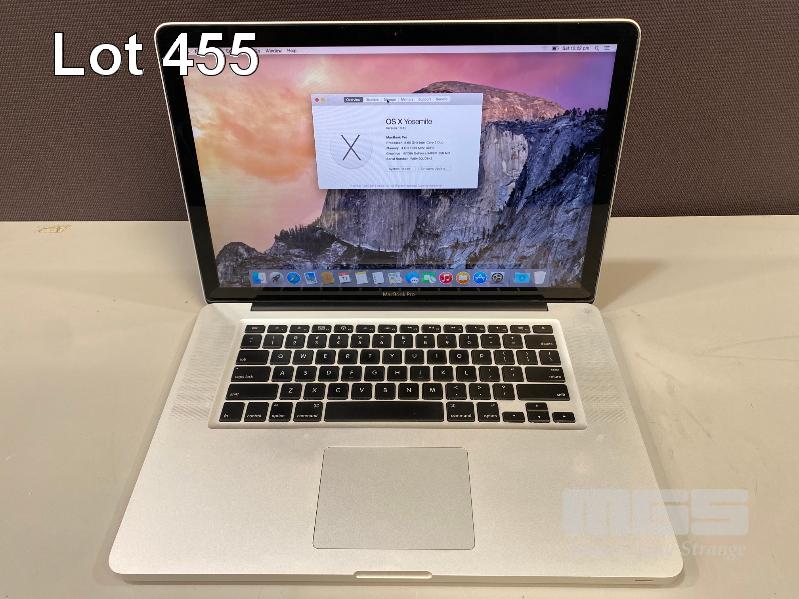 LAPTOP, APPLE MACBOOK PRO (A1286), CORE 2 DUO P8800 @ 2.66GHz, 4GB DDR3 RAM, 128GB SSD, DVD-RW, 15.4" WIDESCREEN (1440x900), 256MB NVIDIA GEFORCE 9400M VIDEO, Wi-Fi, MAC OS 10.10 INSTALLED & POWER SUPPLY S/N:W89490UD642