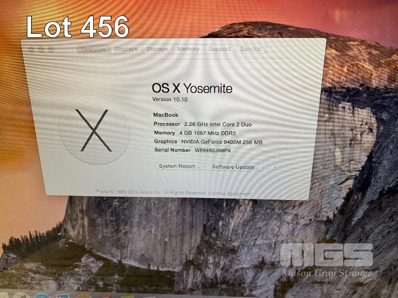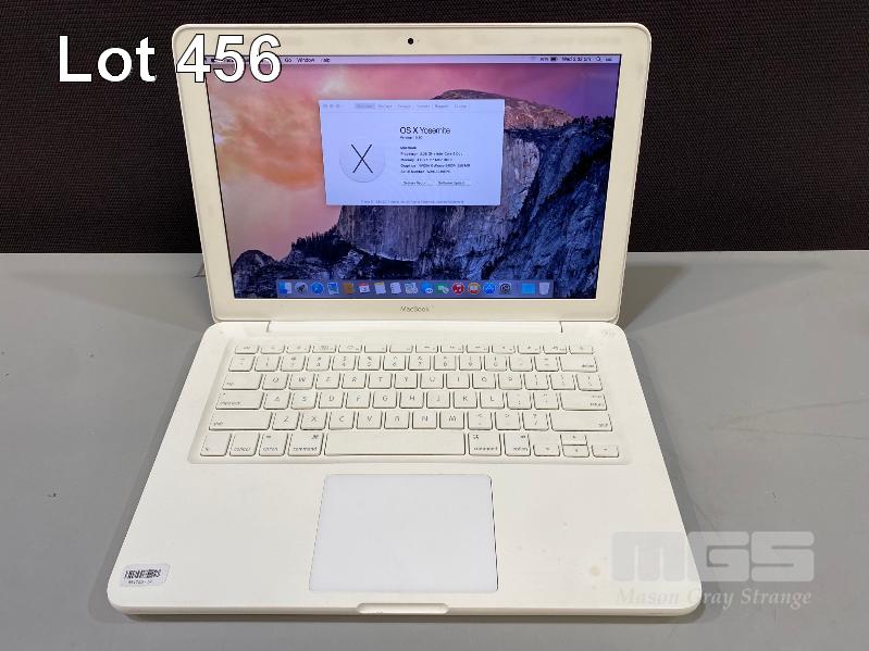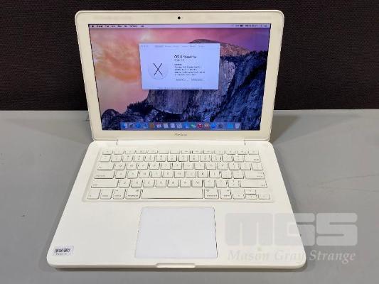 LAPTOP, APPLE MACBOOK (WHITE) (A1342), CORE 2 DUO P7550 @ 2.26GHz, 4GB DDR3 RAM, 128GB SSD, DVD-RW, 13.3" WIDESCREEN (1280x800), 256MB NVIDIA GEFORCE 9400M VIDEO, Wi-Fi, MAC OS X 10.10 INSTALLED (NO POWER SUPPLY) (NOTE: MOUSE TOUCHPAD CLICK FAULTY, DAMAGE TO CASING UNDERNEATH) S/N:W89492J98PX