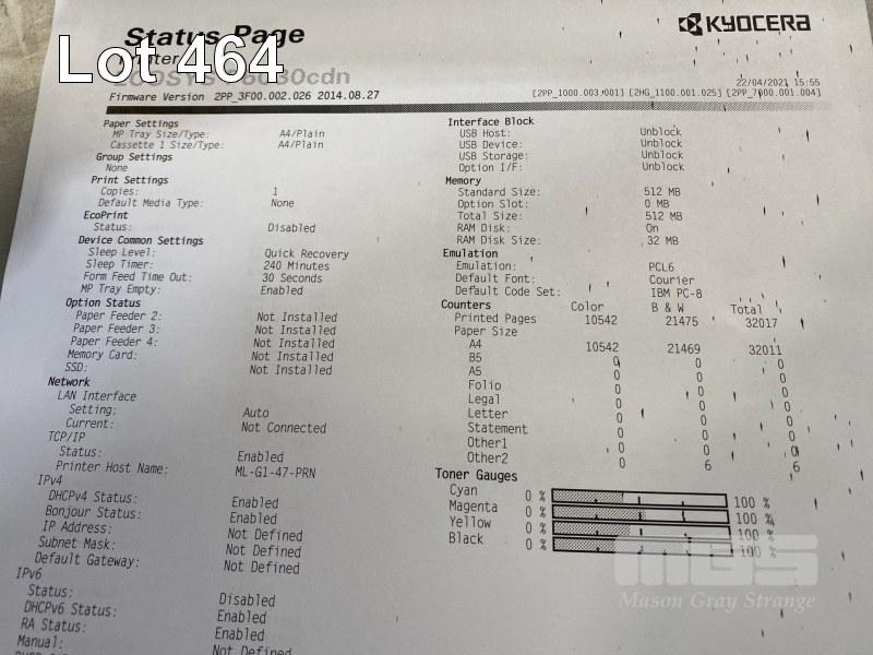 PRINTER, KYOCERA ECOSYS P6030cdn COLOUR LASER, USB, NETWORK, 10,542 COLOUR & 32,016 B&W PAGES (TEST PAGE ATTACHED - POOR QUALITY) S/N:LWT4500386