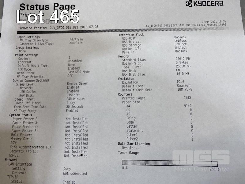 PRINTER, KYOCERA ECOSYS FS-2100DN LASER, USB, NETWORK, 9,143 PAGES (TEST PAGE ATTACHED) S/N:LQB6104884