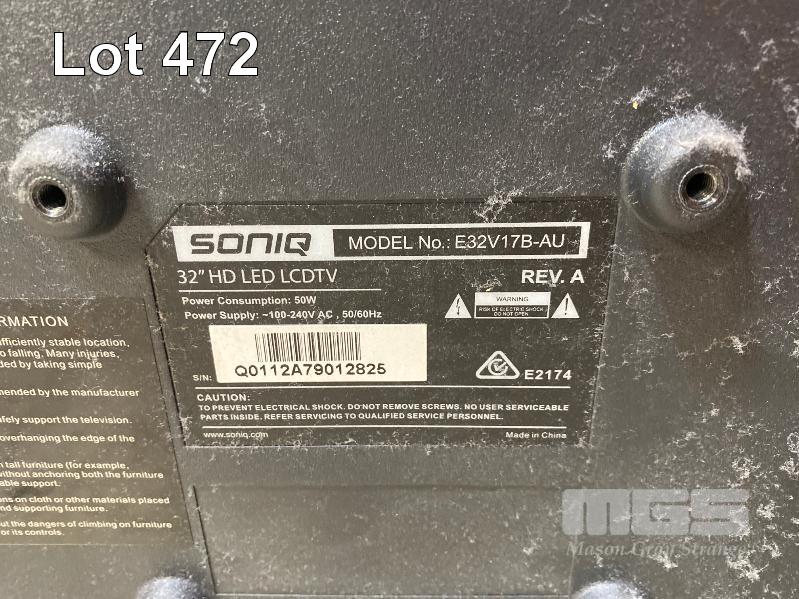 SONIQ 32" LED LCD TV, MODEL E32V17B WITH REMOTE & WALL BRACKET (NO STAND)