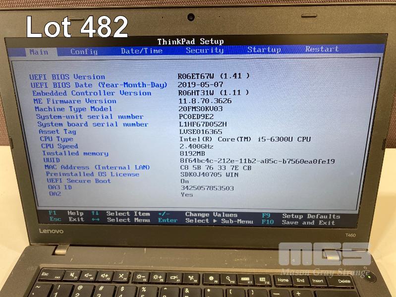 LAPTOP, LENOVO THINKPAD T460 (20FMS0KV03), CORE i5 6300U (6TH GEN) @ 2.4GHz, 8GB DDR3 RAM, 525GB SSD, 14" WIDESCREEN (1366x768), INTEL HD VIDEO, Wi-Fi, BLUETOOTH, WINDOWS 10 PRO INSTALLED & POWER SUPPLY (NOTE: MARKS ON SCREEN) S/N:PC0ED9E2