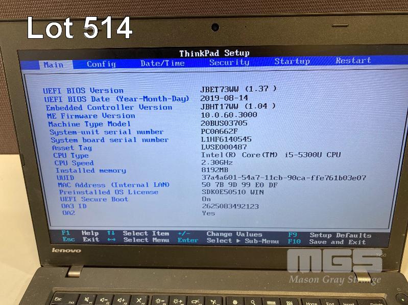 LAPTOP, LENOVO THINKPAD T450 (20BUS03705), CORE i5 5300U (5TH GEN) @ 2.3GHz, 8GB DDR3 RAM, 500GB SATA HDD, 14" WIDESCREEN (1366x768), INTEL HD VIDEO, Wi-Fi, BLUETOOTH, WINDOWS 10 PRO INSTALLED & POWER SUPPLY (NOTE: WHITE SPOT SCREEN BLEMISHES) S/N:PC0A662F